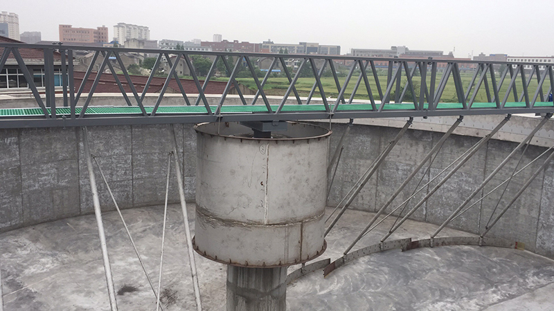 工作桥由安装在周边的驱动机构带动,绕安装在池中心支墩上的中心支座旋转。悬挂在工作桥下的挂臂拖动刮泥板旋转,沉淀在池底的污泥由刮泥板收集至中央集泥坑。液面上的浮渣在浮渣刮板和周边挡渣板形成的渐缩区域内集中,由浮渣刮板刮至集渣斗,排出池外。